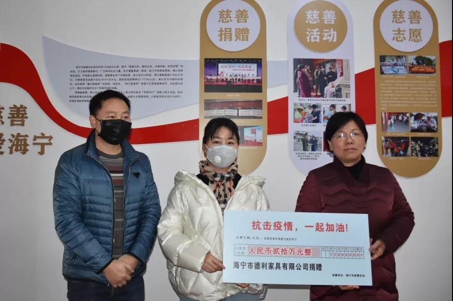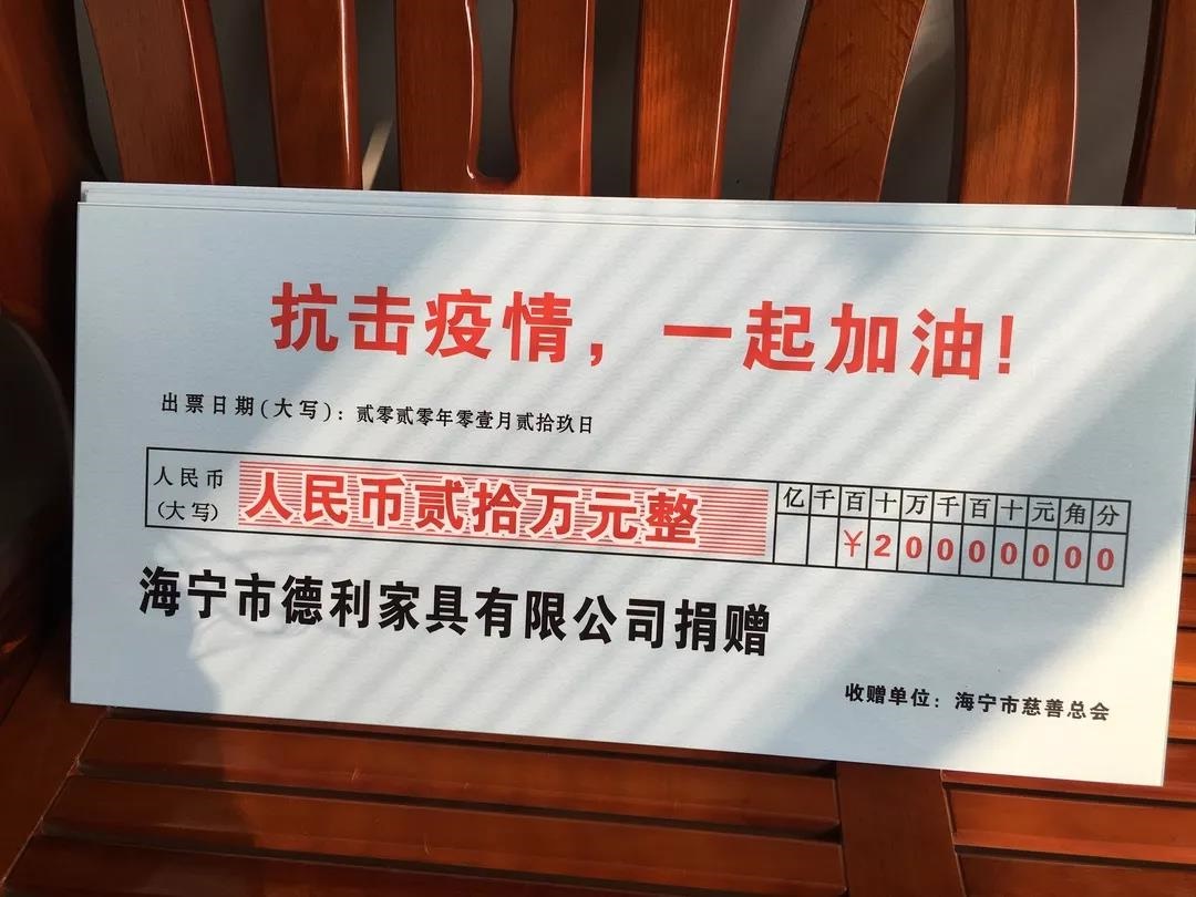 1月29日下午,海寧市德利家具有限公司向海寧市慈善總會(huì)捐贈(zèng)20萬(wàn)元,其中10萬(wàn)元定向捐贈(zèng)給周王廟鎮(zhèn)人民政府,用于疫情防控所需。